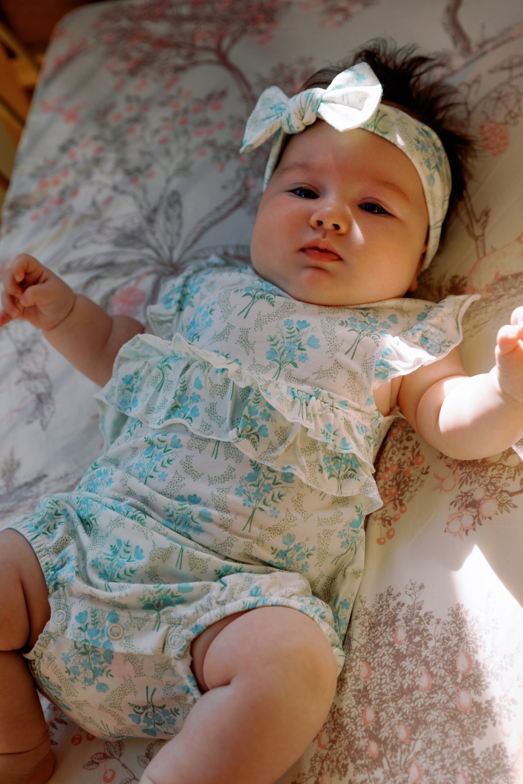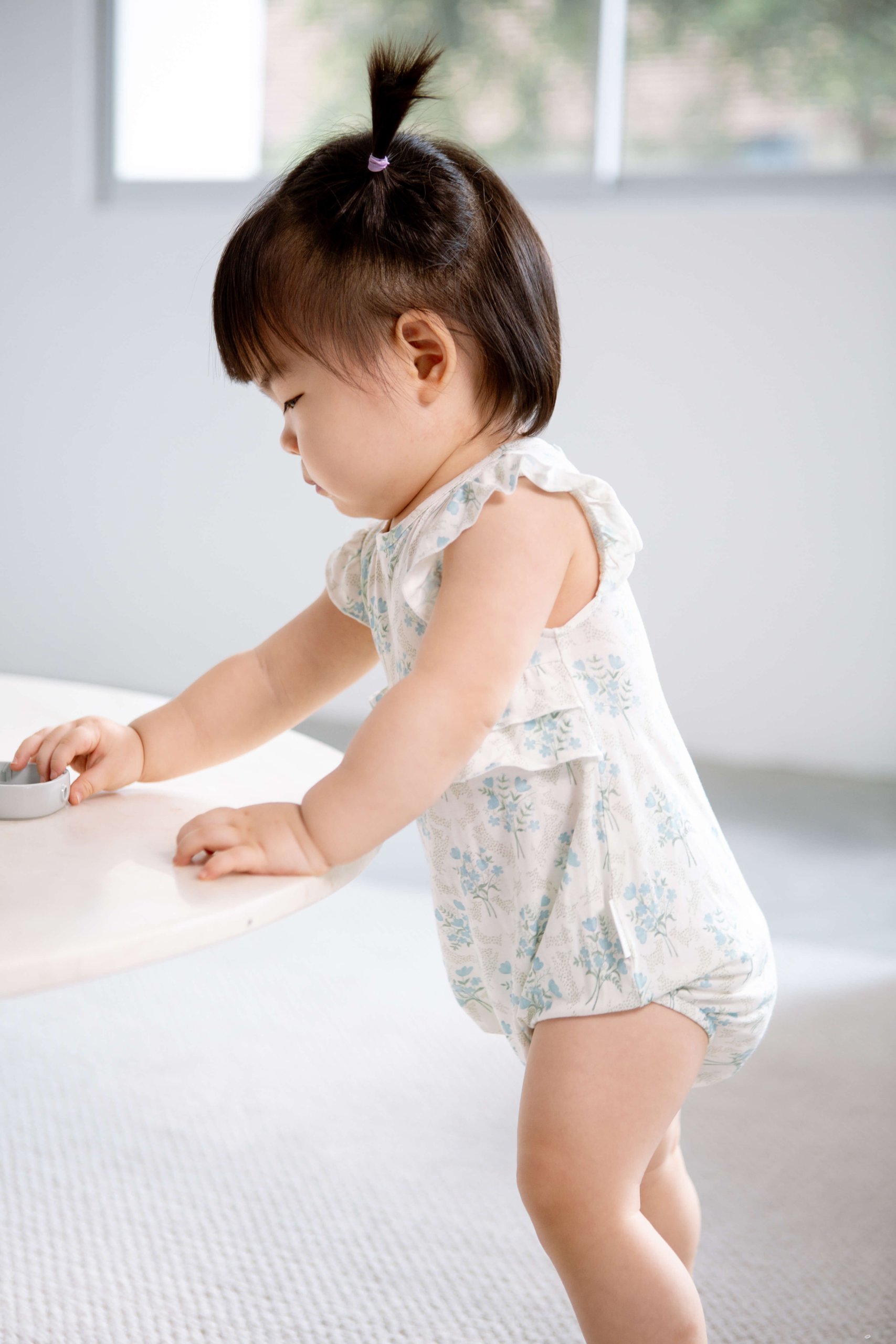 The Cap Sleeve Ruffle Romper – Victorian (Blue Posies), is a stunning creation that radiates timeless elegance and sophistication and is designed to leave an indelible mark on any event.