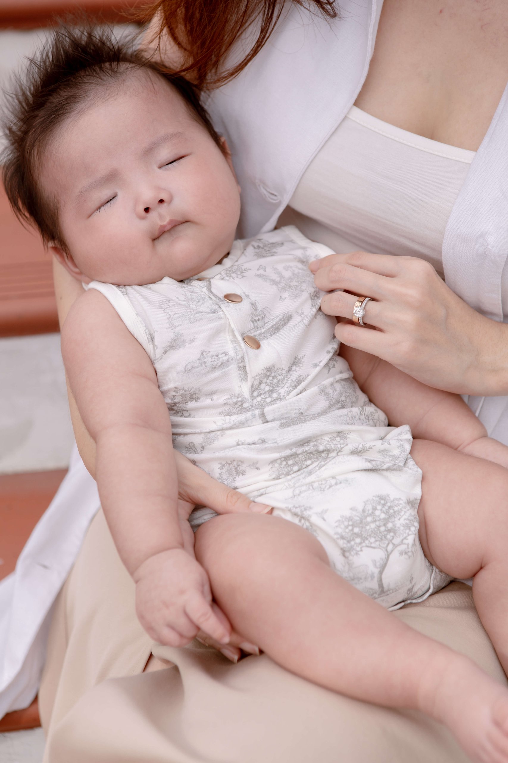 Four-way stretch romper with gold snap buttons on the back grows with your little bub, and makes for the perfect tropical weather comfort wear at home and out.