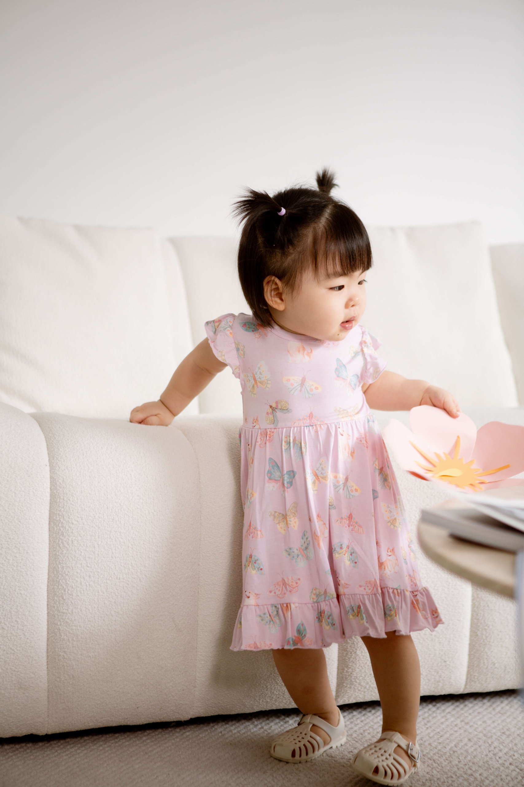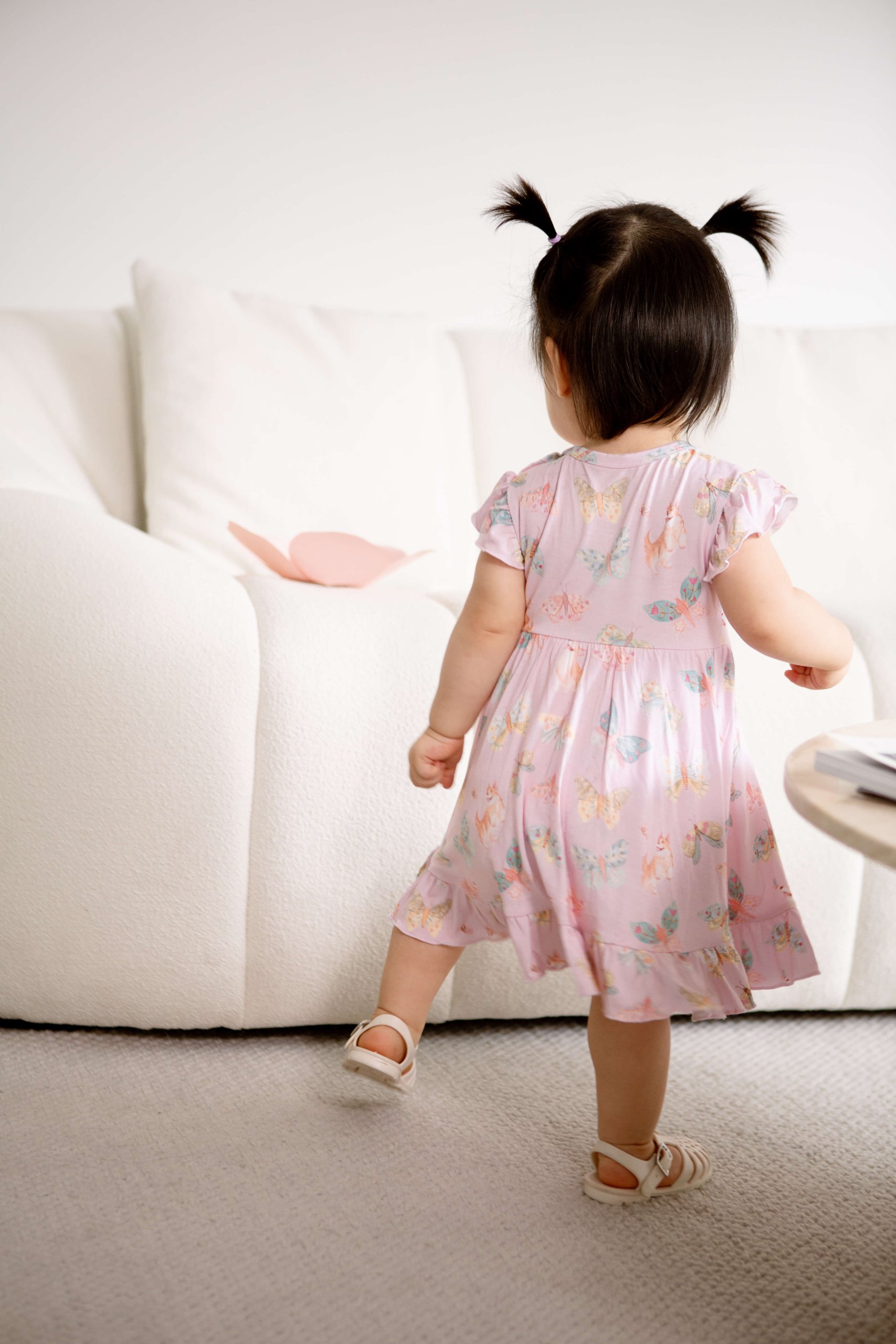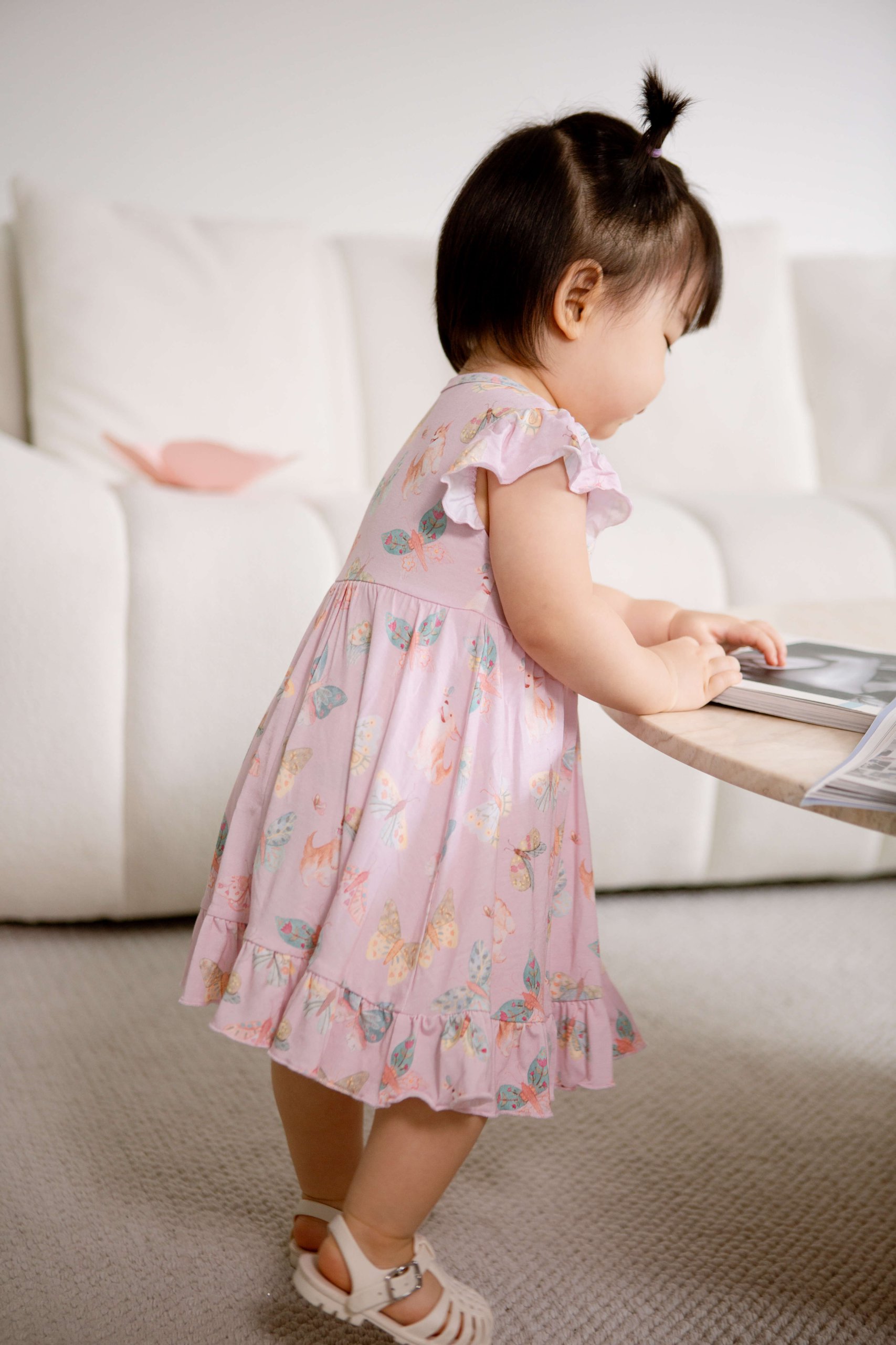 With its flutter sleeves and twirl-worthy skirt, this romper exudes a sense of joy and carefree spirit, perfect for any event. The Butterfly Soiree print is a visual masterpiece, that features meticulously hand-drawn butterfly designs set amidst a picturesque garden scene, where Holly’s playful presence adds an extra layer of charm. Every detail in this print tells a story, making it a meaningful addition to your child’s wardrobe.