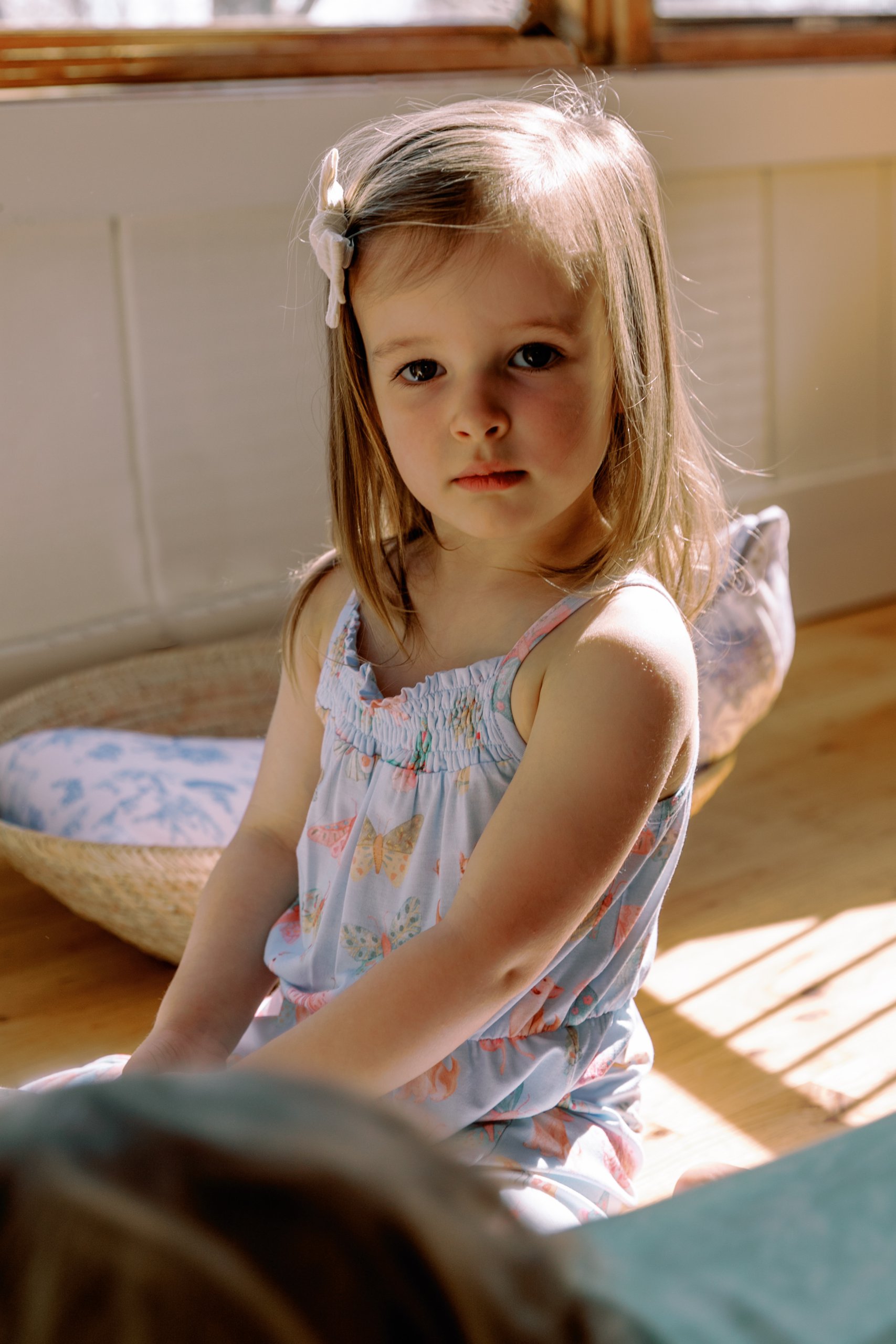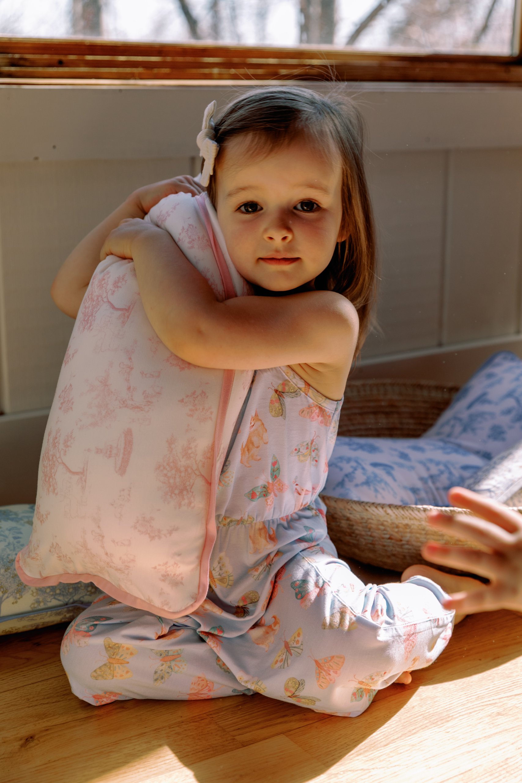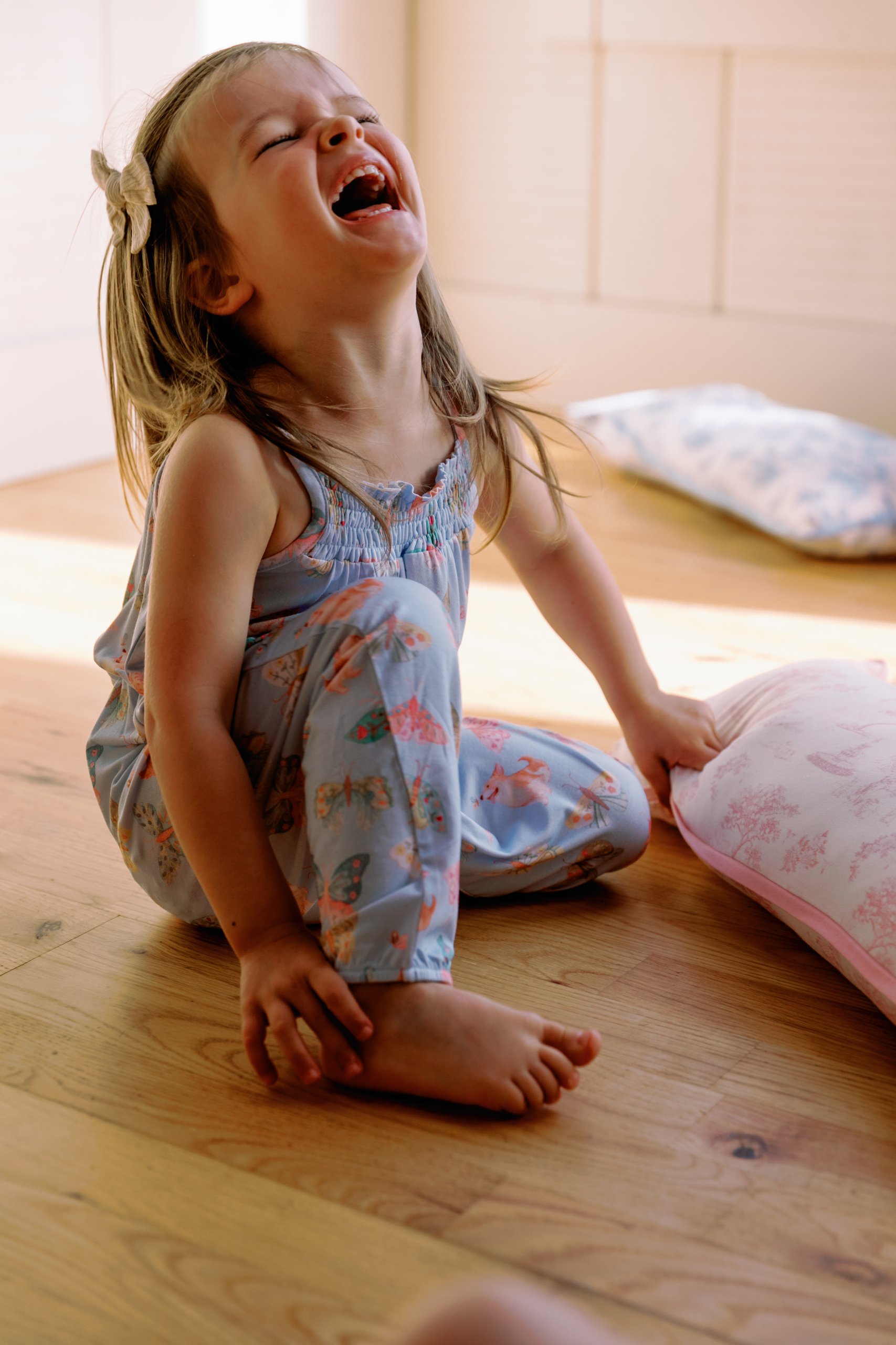 The Butterfly Soiree print is a visual masterpiece that features meticulously hand-drawn butterfly designs set amidst a picturesque garden scene, where Holly’s playful presence adds an extra layer of charm. Every detail in this print tells a story, making it a meaningful addition to your child’s wardrobe.