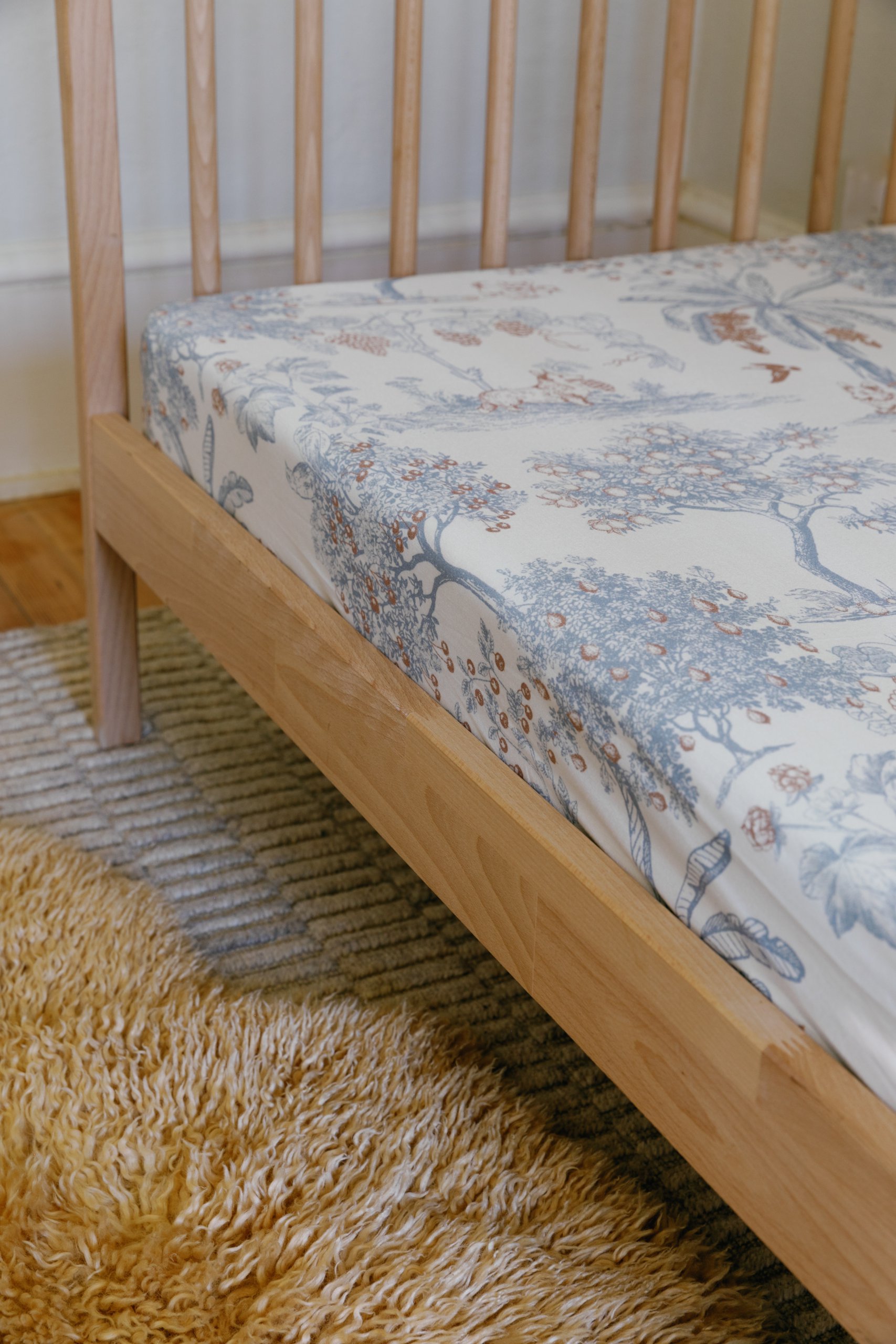 The new dual-tone Fruit Toile print is a visual delight, showcasing a serene fruit yard scene infusing natural beauty into your nursery. This exquisite design transforms the crib into a piece of art, ready to be admired and cherished.