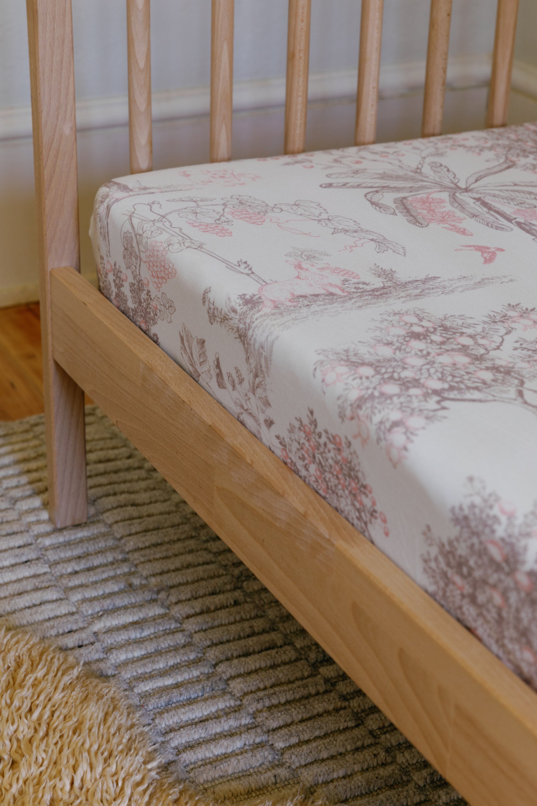 The new dual-tone Fruit Toile print is a visual delight, showcasing a serene fruit yard scene infusing natural beauty into your nursery. This exquisite design transforms the crib into a piece of art, ready to be admired and cherished.