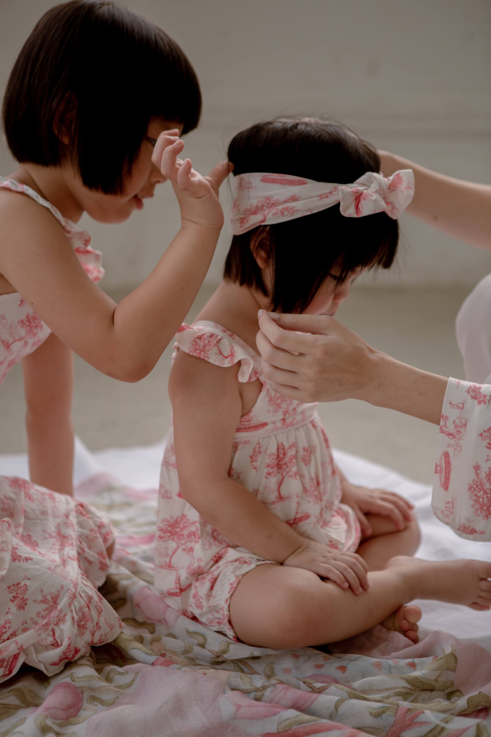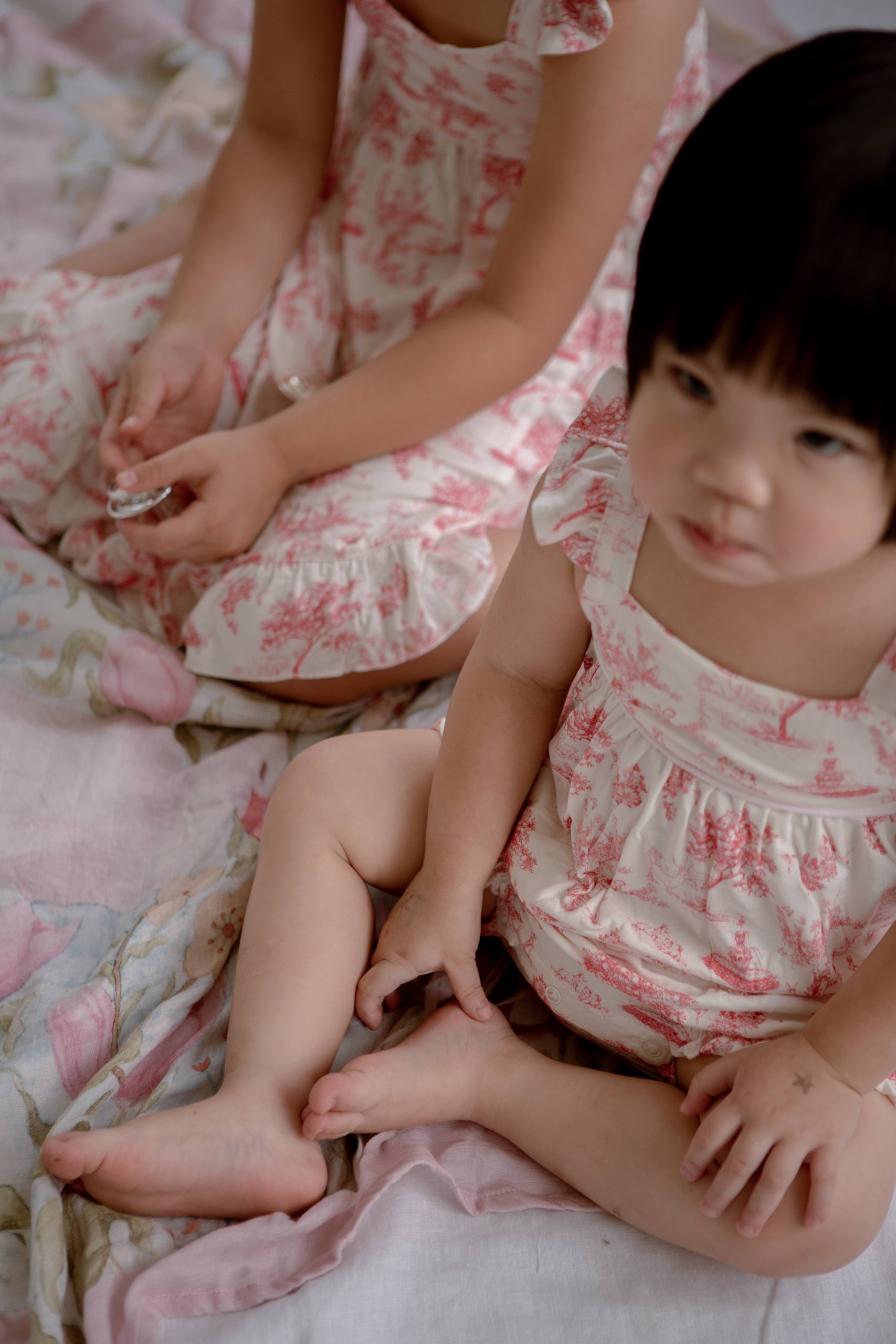 Ruffle cap sleeve bubble rompers with ruffle details on straps with our signature House of Holly Toile de Jouy print is the sweetest look for playtime and beyond.