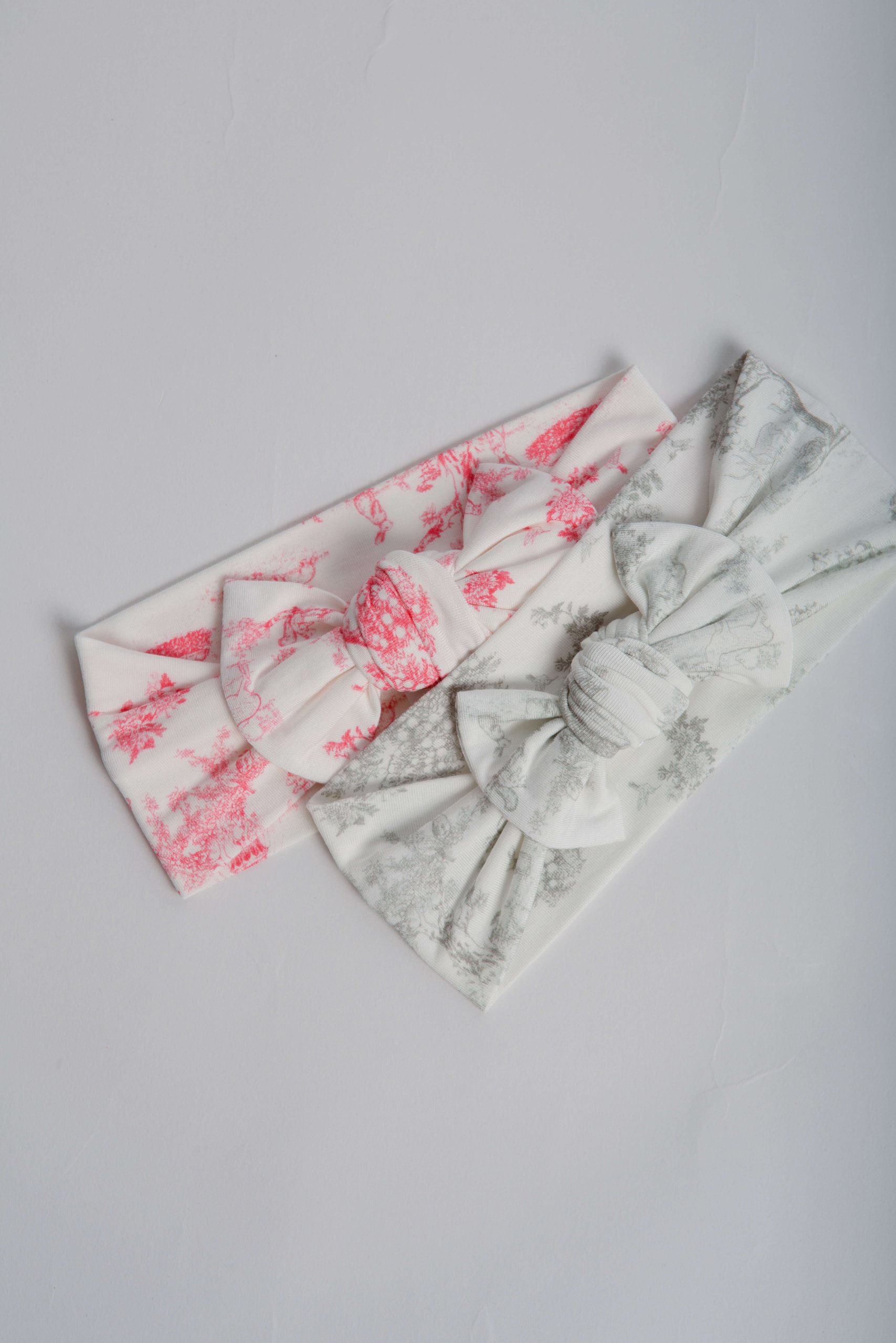 This baby girl ribbon headband is the perfect addition to her headband collection! Extremely soft and stretchy, and comes with a removable topknot. Designed to be mixed and matched with our signature Toile de Jouy collections.